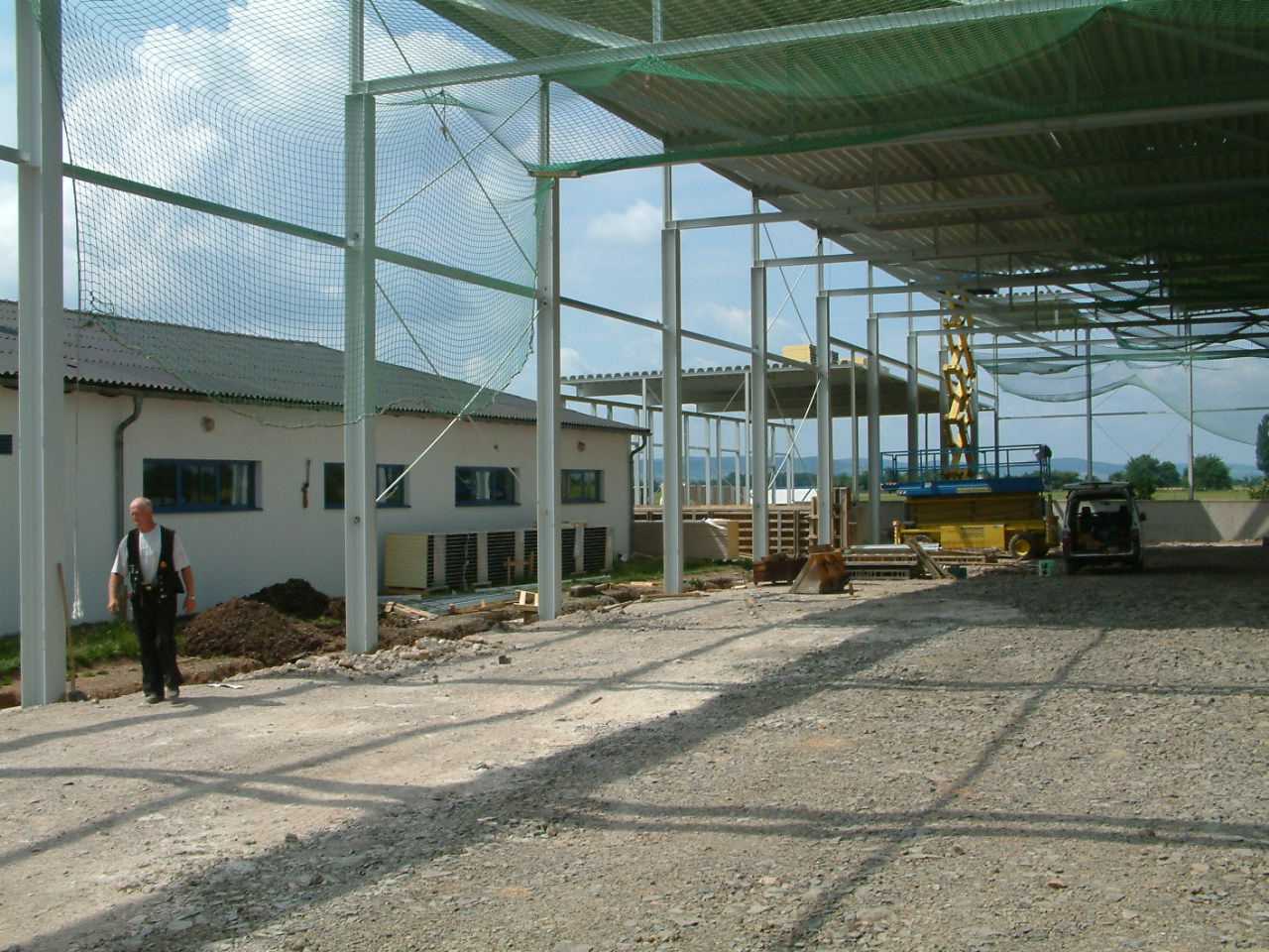 Nur 12 Arbeitstage später:Der Stahl steht,die Trapezbleche für das Dach sind montiert