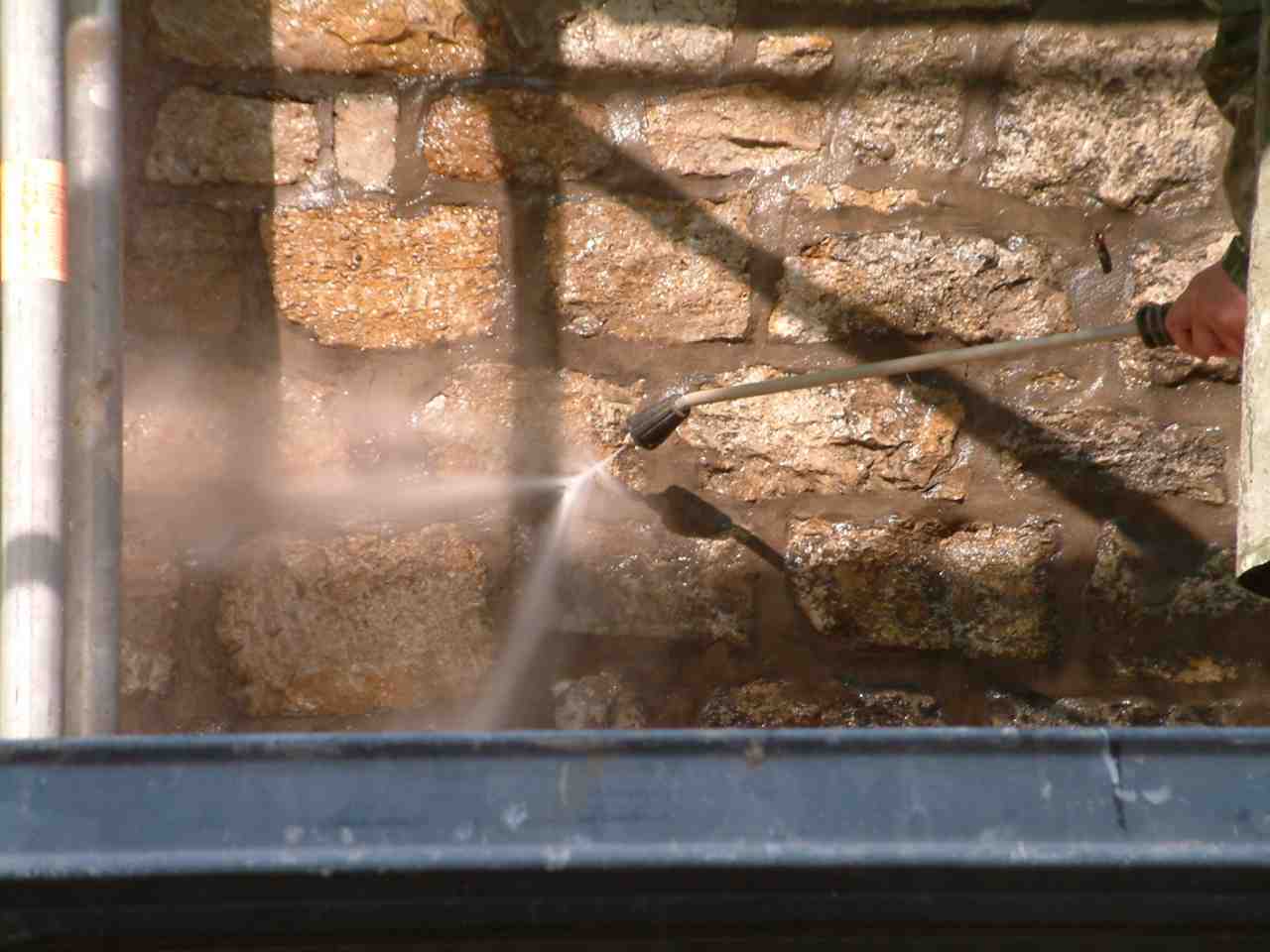 Säuberung der Fassade aus Bruchsteinen des Teutoburger Waldes mit Hochdruck (etwa 175 bar)