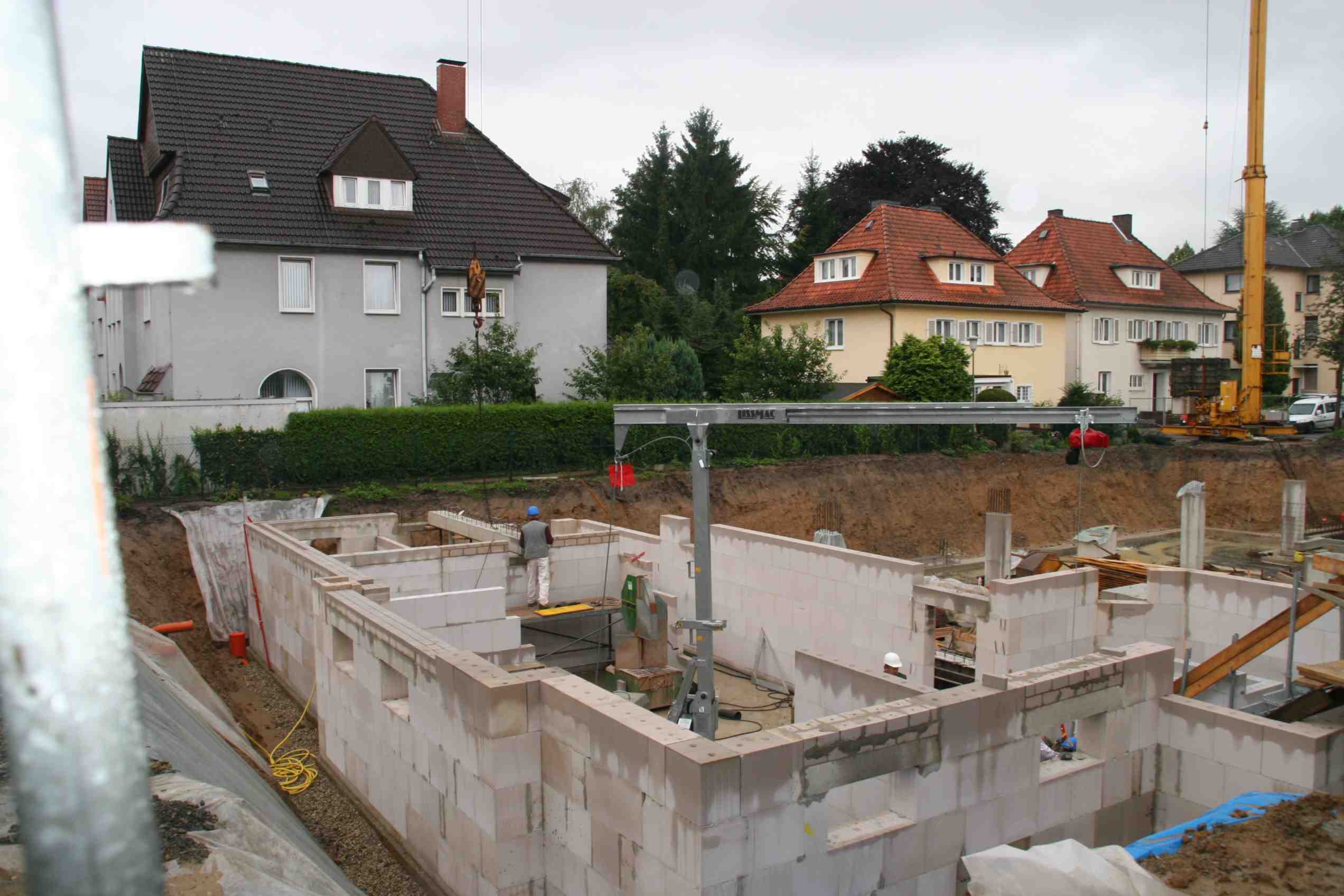 Das Kellermauerwerk entsteht mit großformatigen Kalksandsteinen Die Einzelgewichte sind so schwer, dass mit Kranverlegung gearbeitet werden muss