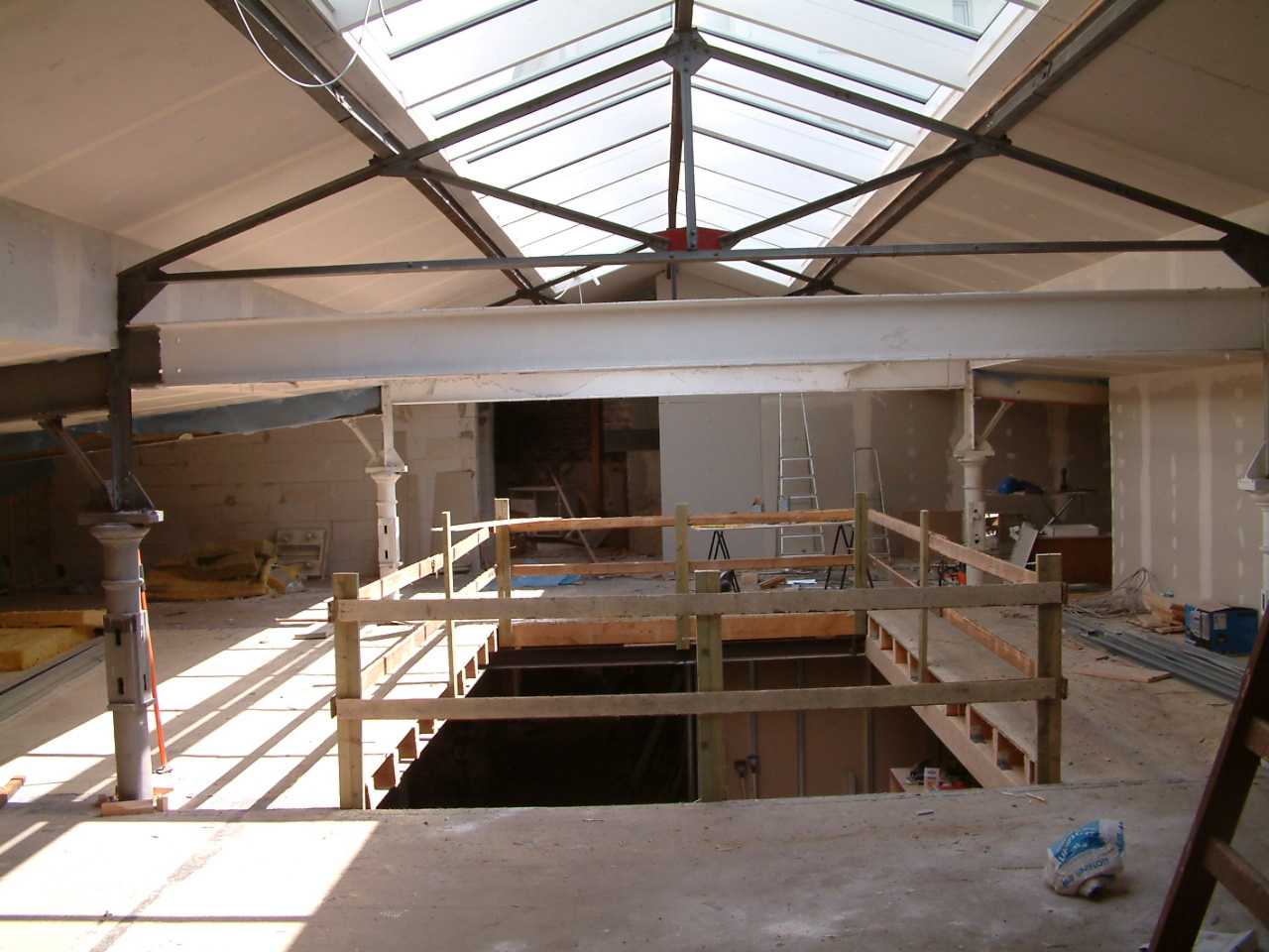 Das alte Oberlicht wurde saniert. Die Zwischendecke teilweise entkernt und auf wesentliche Teile reduziert