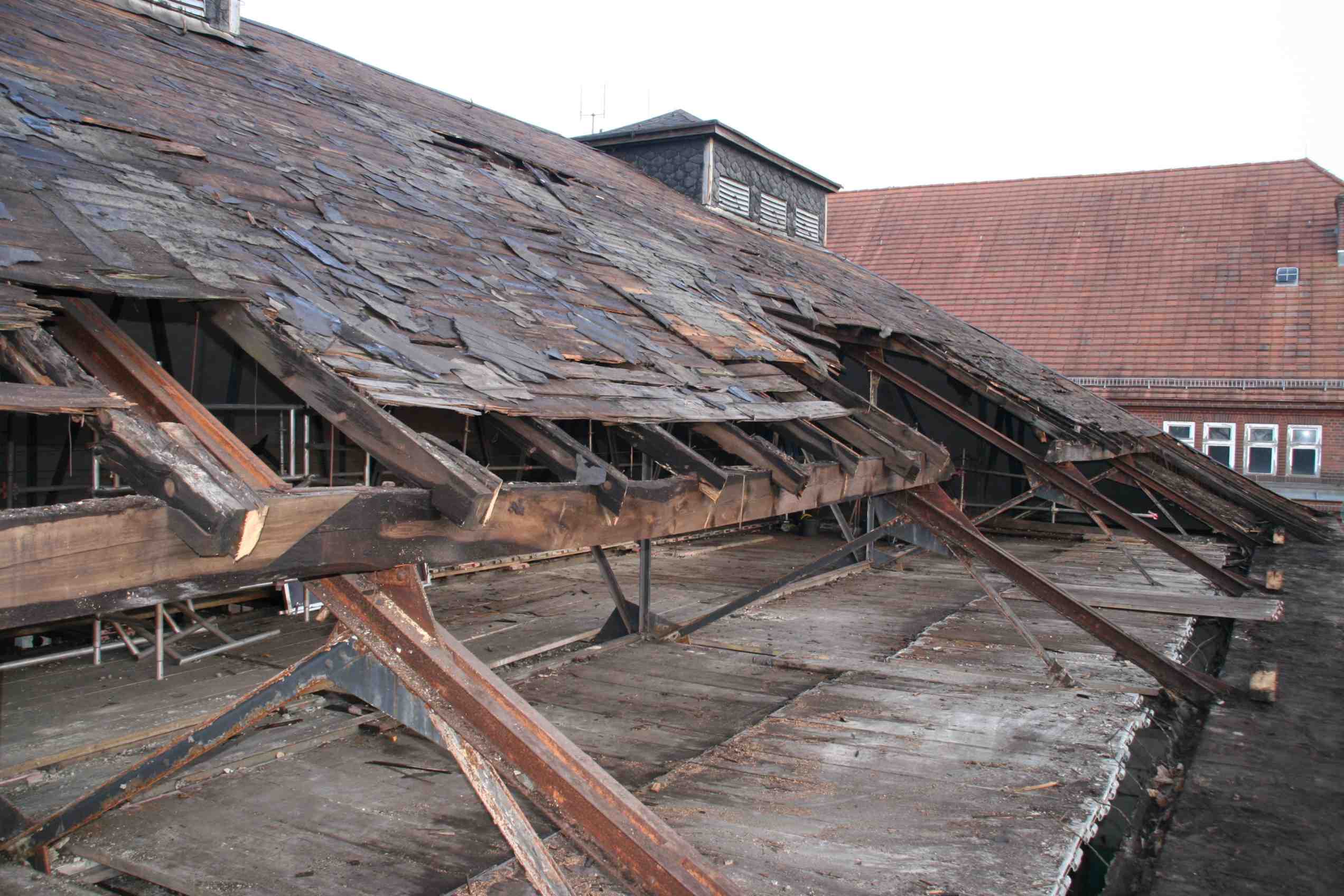 Nachdem die Gerüstbohlenlage eingebracht war, konnten die Schadensanalysen beginnenEs musste mehr als die doppelte Fläche ausgewechselt werden, als vorab geschätzt
