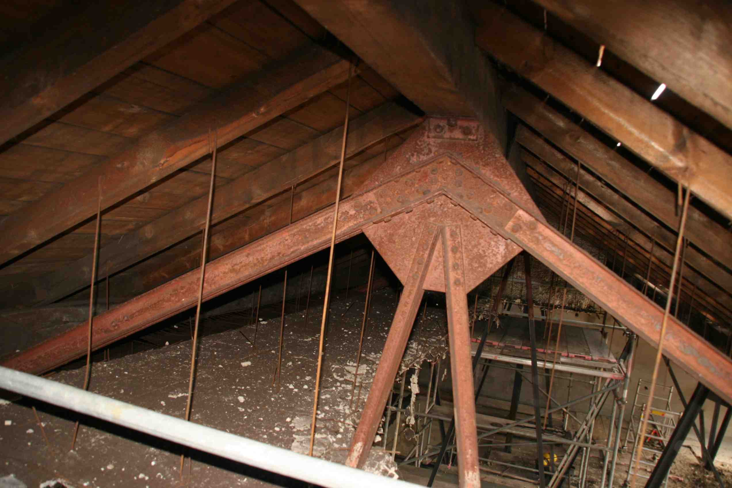 Blick unter den First in rund 15 Meter Höhe über dem Fußboden