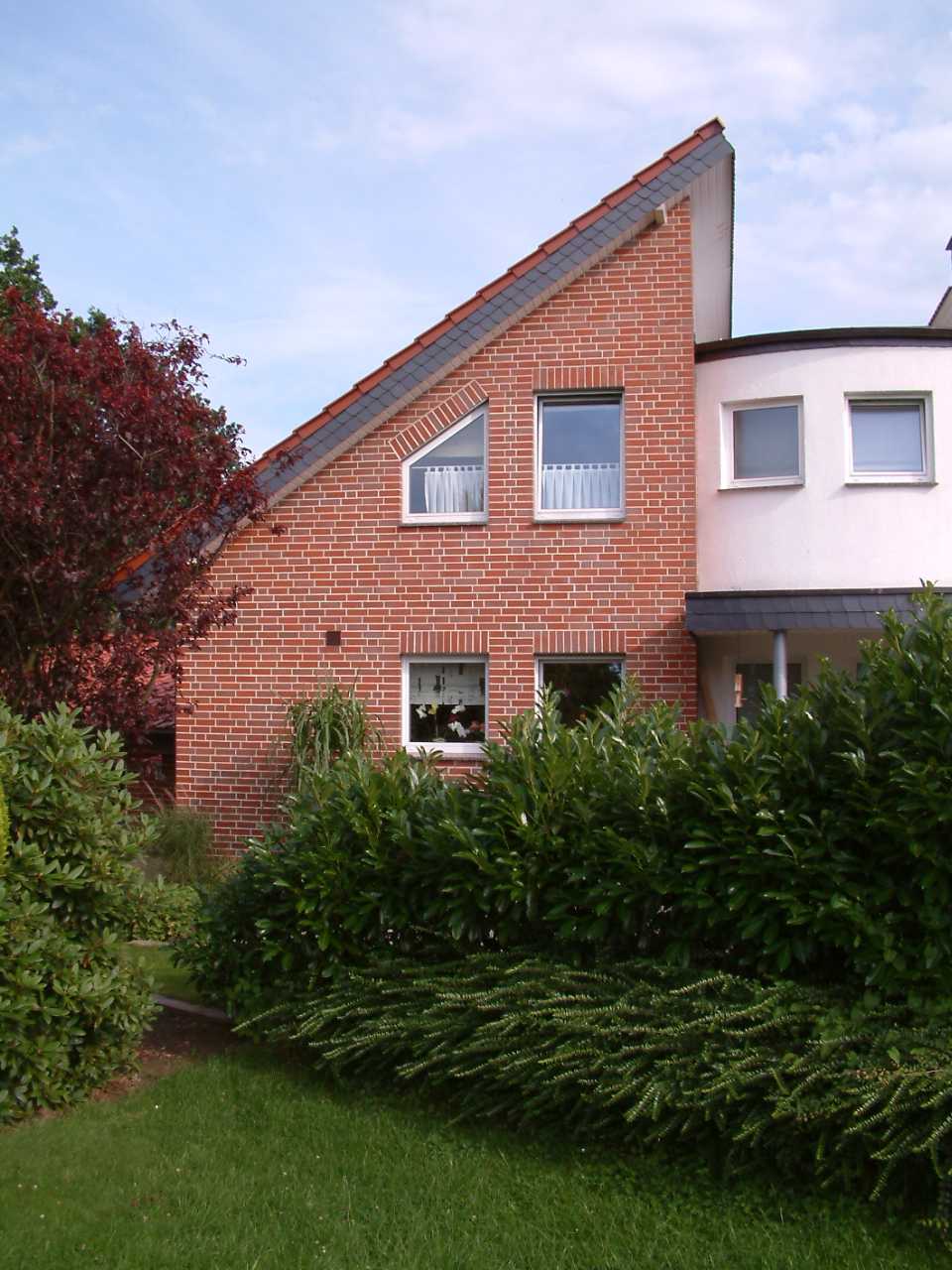 Der kecke Pultgiebel hebt sich gegen den Mittelbau deutlich in Form, Material und Oberfläche ab