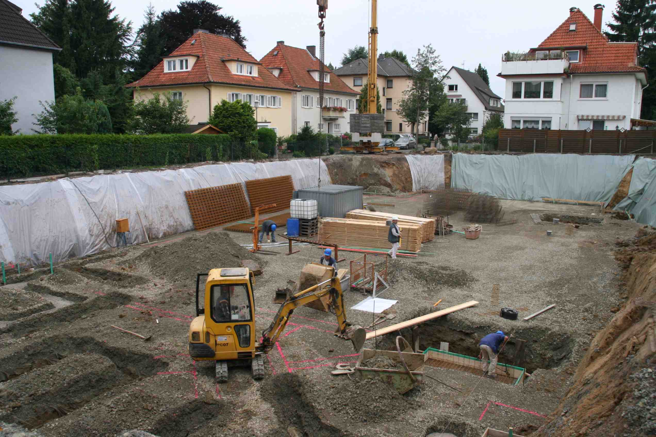 Erdarbeiten für Einzel- und Streifen-fundamente im Bereich des Kellers und der Tiefgarage Rechts unten ist die Fahrstuhlunterfahrt zu sehen